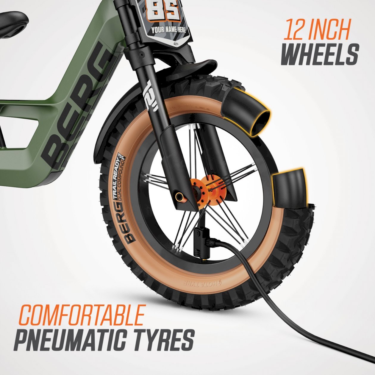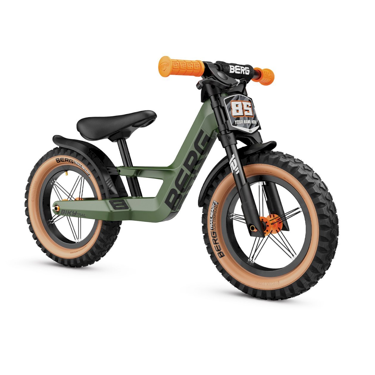 With its mountain bike looks and standard accessories including a handbrake, front and rear mudguards, cool skinwall tyres and a number plate, you'll be ready for any terrain. The number plate can be personalised with the sticker sheet provided with a racing number and your own name. How cool is that! Besides these unique features, as with the other models in the BERG Biky family, this balance bike offers; an ultra-light frame, a safe handlebar deflection limiter and an adjustable saddle. Making this cool green balance bike ready for any adventure. Are you ready too?